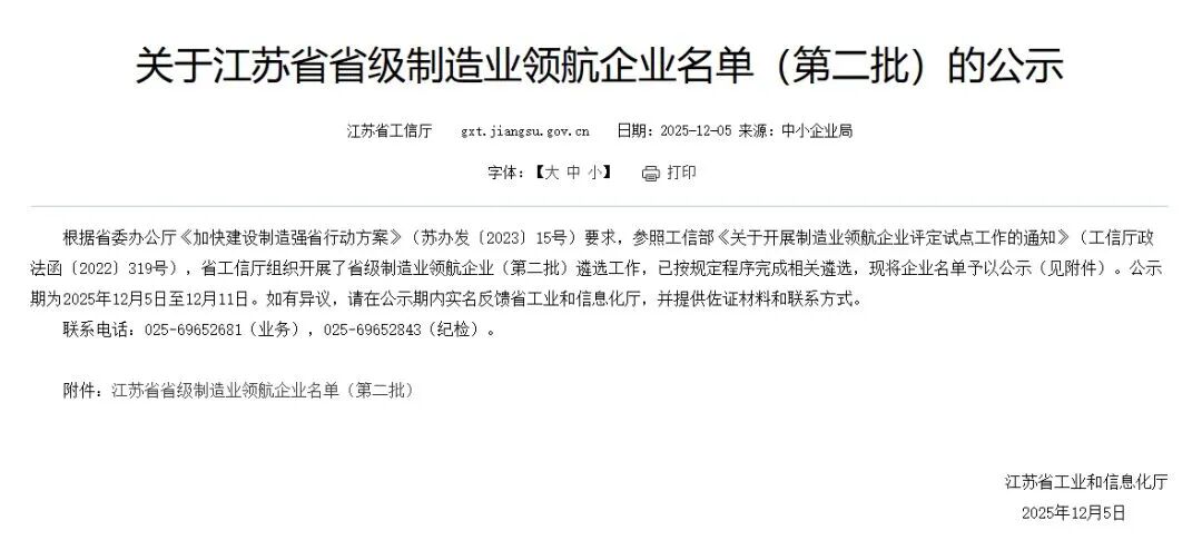 省级制造业领航企业,是江苏省构建“专精特新—单项冠军—领航企业”梯度培育体系中的顶尖层级,入选企业在技术、标准、市场等方面拥有强大话语权与影响力,能够有效整合产业链,带动行业发展。